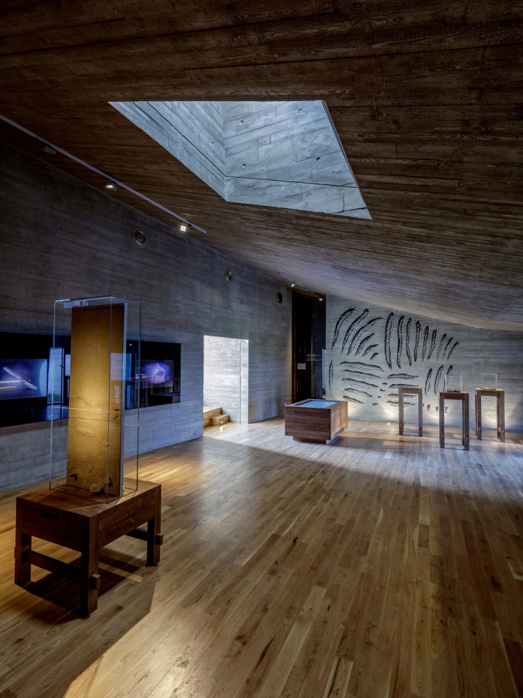 Most of the building is underground and the aforementioned towers provide the only natural light, giving the feeling of entering a prehistoric cave. The archeological site and its artifacts, including skeletons, were integrated into the design of the building, requiring meticulous coordination between the archeologists, designer, contractor and suppliers. The resulting single-floor building includes training premises, a cinema and two galleries for individual exhibits.
